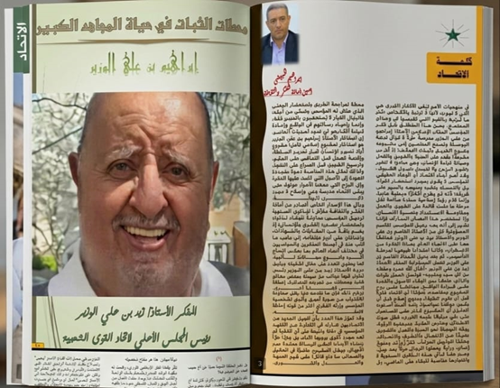 وتصدّر العدد مقال هام للمفكر الأستاذ زيد بن علي الوزير، رئيس المجلس الأعلى للاتحاد، تناول فيه مواقف الثبات في حياة الراحل وقدرته على الجمع بين الوفاء للأصول وقراءة الواقع المعاصر وأشار إلى أن فكر إبراهيم الوزير لم يكن منغلقاً، بل كان عادلاً وبوصلة تمنح الوضوح في أحلك الظروف. وأن الاتحاد فكرة ومنهج إصلاحي قبل أن يكون تنظيماً سياسياً، وأن الرسالة ممتدة عبر الأجيال.