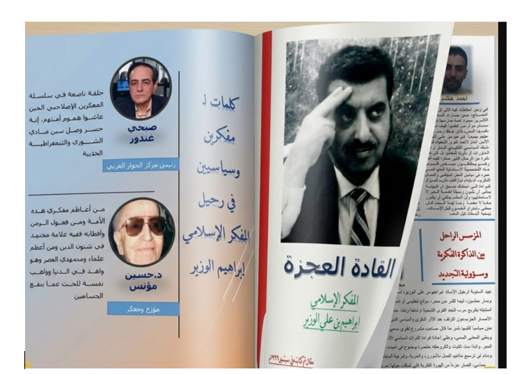 وأفرد الإصدار مساحة واسعة لتحليل رؤية المفكر الاسلامي إبراهيم الوزير في “التجديد والتنوير” حيث صاغ الراحل معادلة ثلاثية تركز على تحرير الإنسان من خلال الشورى في الأمر والعدل في المال والخير في الأرض