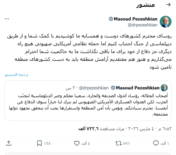 قائلا في تدوينة على منصة اكس: “الى أصحاب الجلالة، رؤساء الدول الصديقة والجارة، سعينا معكم وعبر الدبلوماسية لتجنّب الحرب، لكن العدوان العسكري الأمريكي – الصهيوني لم يترك لنا خياراً سوى الدفاع عن أنفسنا”.