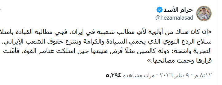 «إن كان هناك من أولوية لأي مطالب شعبية في إيران، فهي مطالبة القيادة بامتلاك سلاح الردع النووي الذي يحمي السيادة والكرامة وينتزع حقوق الشعب الإيراني. التجربة واضحة: دولة كالصين مثلًا فُرض هيبتها حين امتلكت عناصر القوة، فأمّنت قرارها وحمت مصالحها.»
