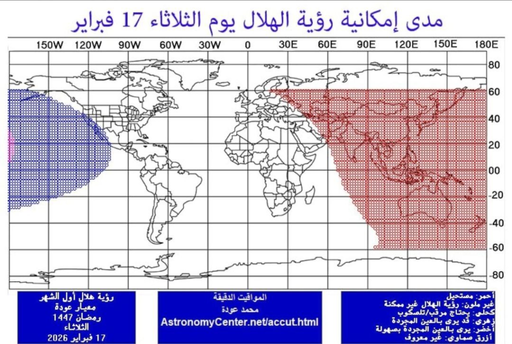 أعلن أن رؤية هلال رمضان يوم الثلاثاء 17 فبراير 2026 مستحيلة من جميع مناطق العالم الإسلامي سواء بالعين المجردة أو التلسكوب أو حتى بأحدث تقنيات التصوير الفلكي.