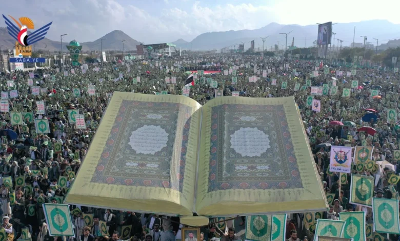 طوفان بشري غاضب بالعاصمة صنعاء في مسيرة نفير واستنفار.. نصرة للقرآن الكريم وفلسطين